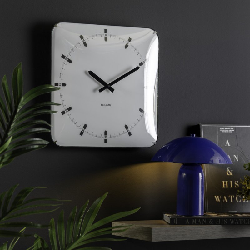 The Sucinto Dome Square by Karlsson is a square wall clock with rounded corners and a spherical glass top.