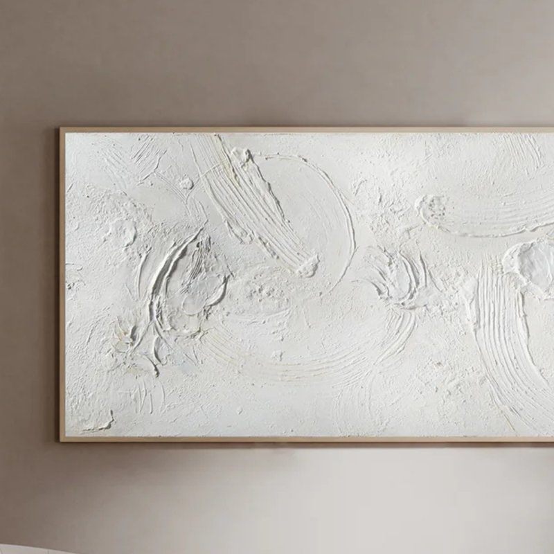 The marriage of plaster and acrylic paint creates a dramatic impact while maintaining a peaceful quality.